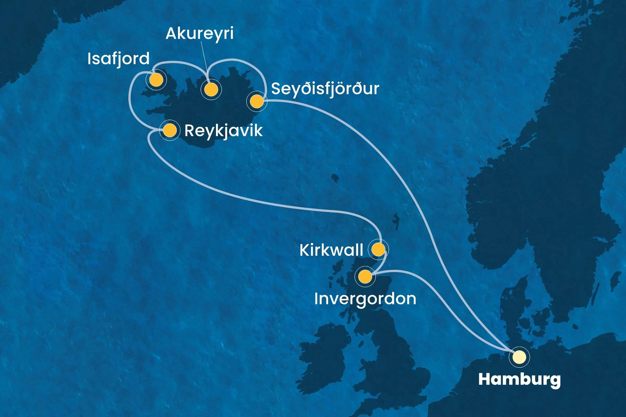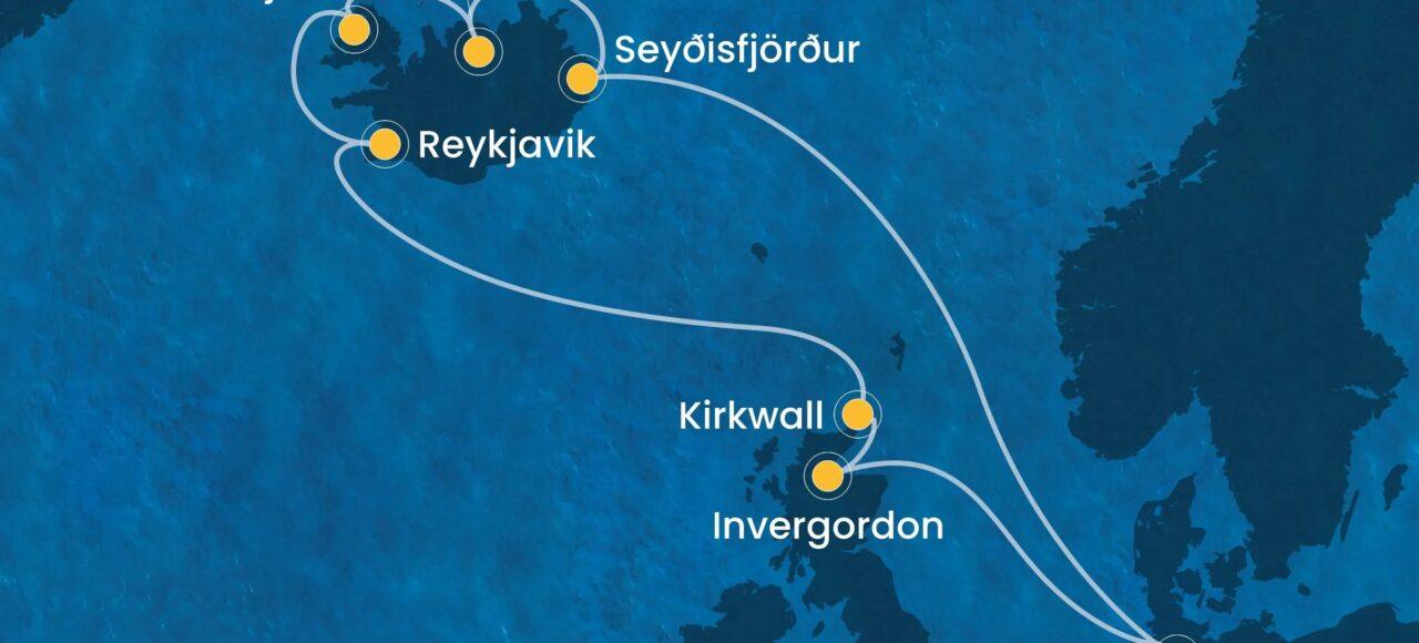 Pristanek v enem izmed najbolj slikovitih islandskih fjordov, znanem po naravnih lepotah in živahni lokalni kulturi. Možni izleti vključujejo raziskovanje pravljične arhitekture, slapov ter tradicionalnih delavnic.