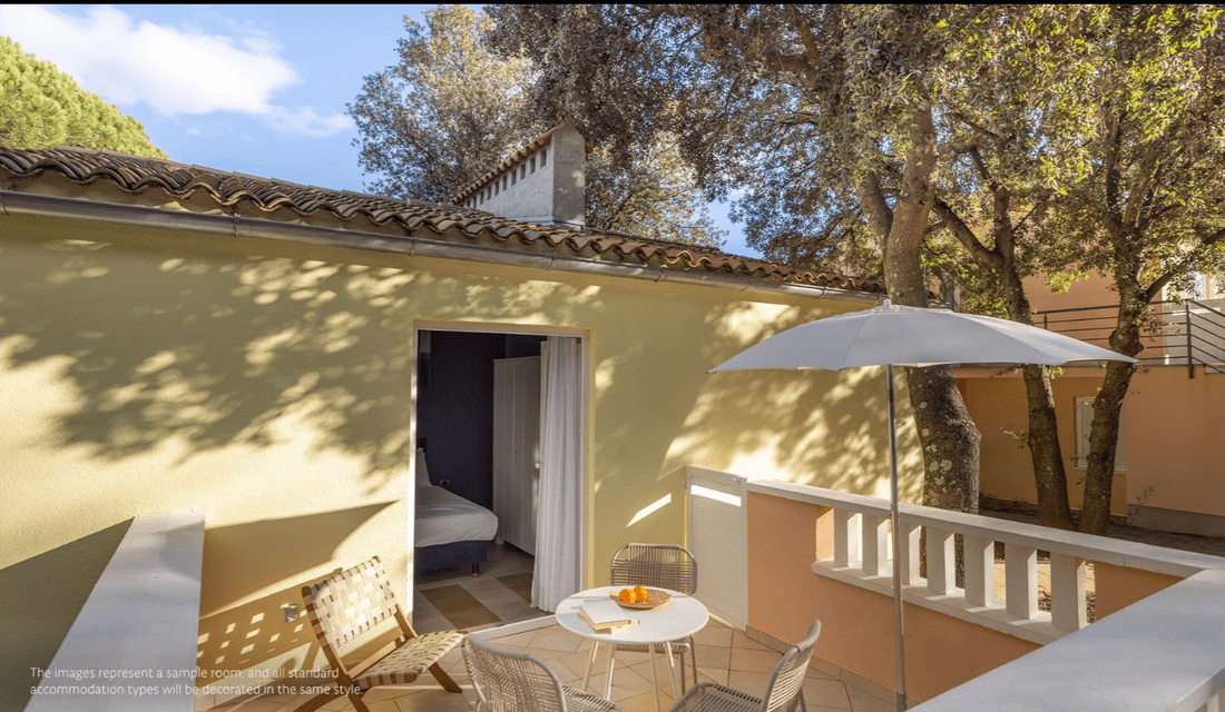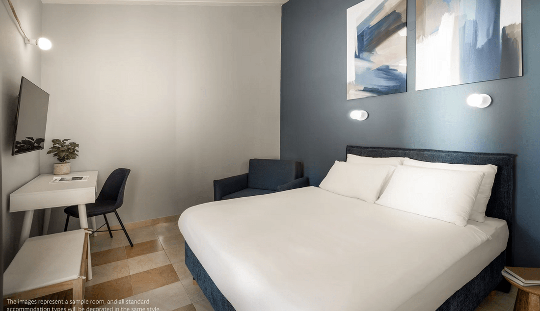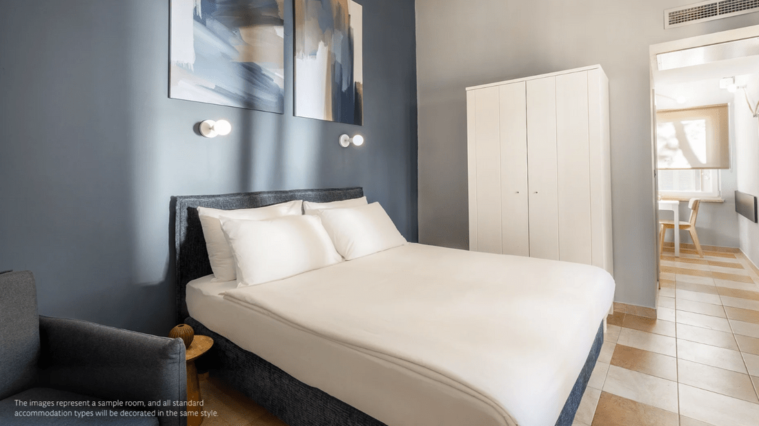 SOBE: 140 sob; klima, prib. 23 m2, SAT TV, sef, sušilnik za lase, dnevno-spalni prostor s francoskim ležiščem (160×200) in raztegljivim foteljem, kopalnica (prha/WC), terasa.